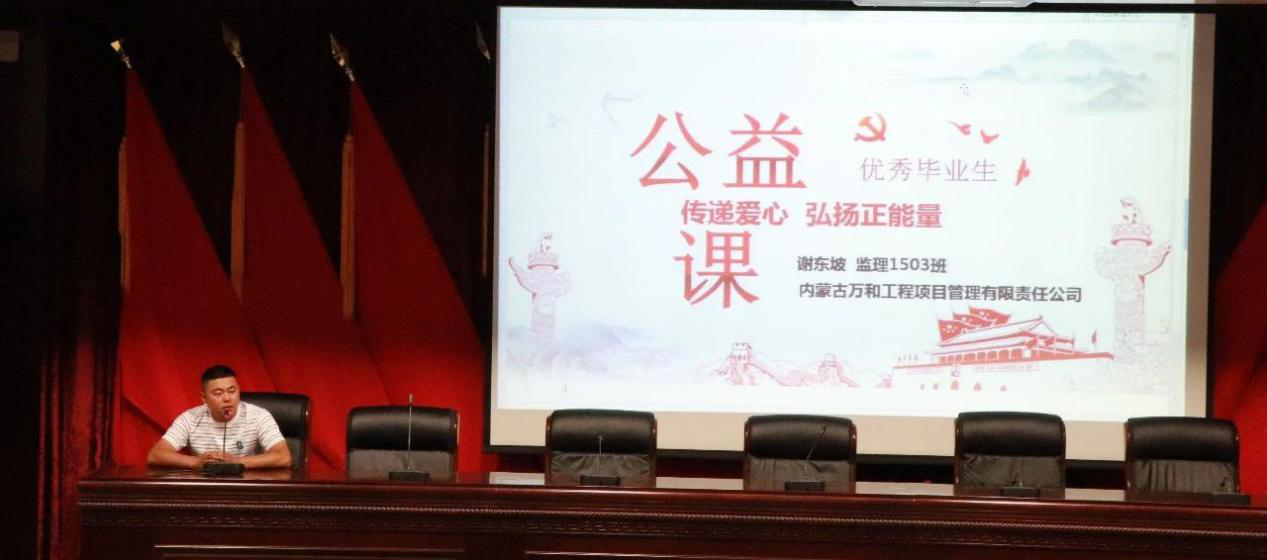 2019年6月,謝東坡受內蒙古建筑職業(yè)技術學院工程管理學院邀請回校開展《傳遞愛心,弘揚正能量》公益講座,通過:制定明確目標、合理規(guī)劃時間、獨立思考、團隊協(xié)作、積極主動勇敢創(chuàng)新、服務社會等方面與同學們積極分享他所總結的大學生學生工作及社會工作經(jīng)驗。作為一名中共預備黨員,他在座談中提到,堅定正確的政治立場,積極向黨組織靠攏,以正確的世界觀、人生觀、價值觀為指導,堅持中國共產(chǎn)黨的領導,做到始終在思想上、行動上與黨組織保持一致。
