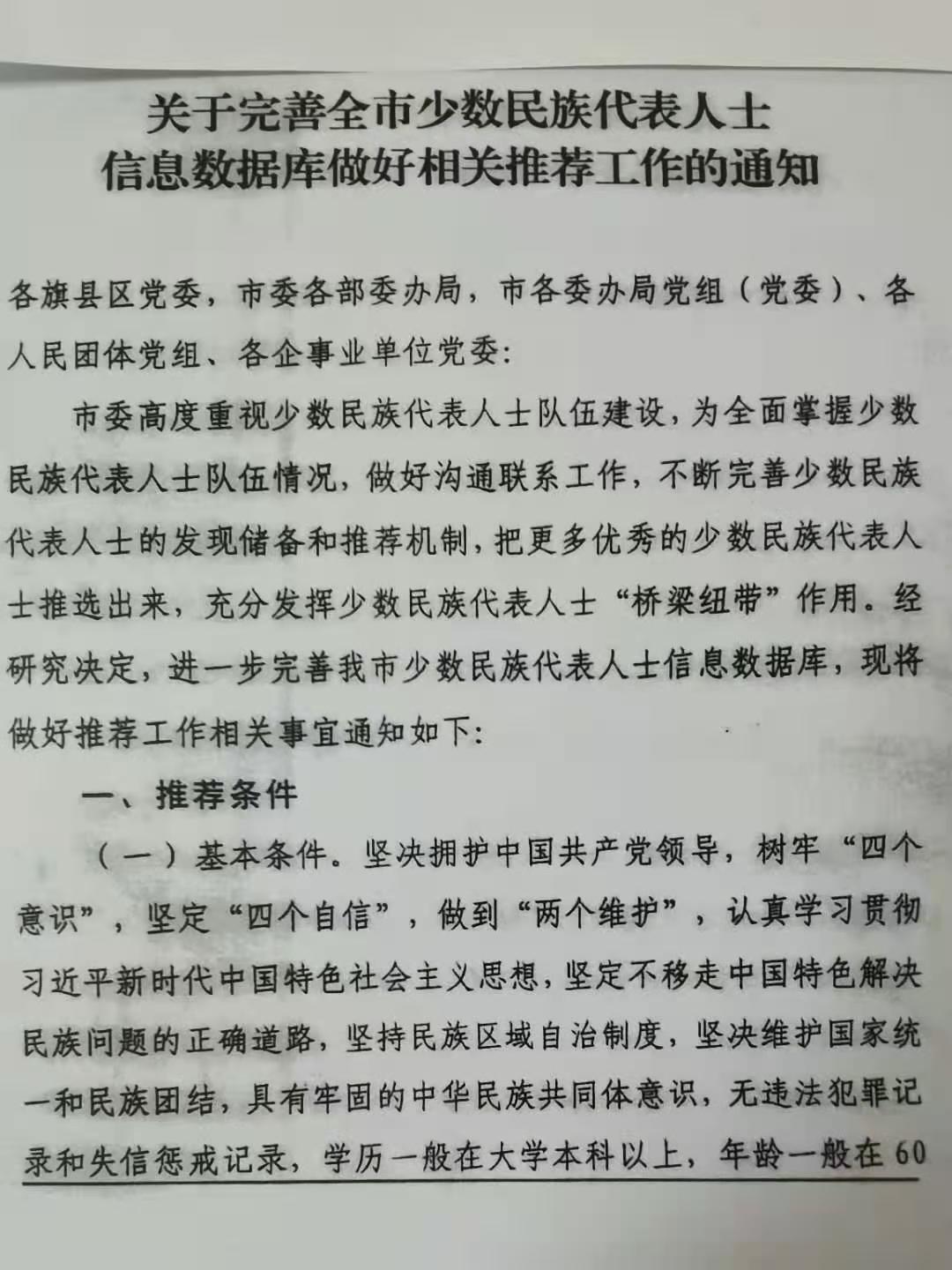 信息數(shù)據(jù)庫(kù)做好相關(guān)推薦工作的通知各旗縣區(qū)黨委,市委各部委辦局,市各委辦局黨組(黨委)、各人民團(tuán)體黨組、各企事業(yè)單位黨委:市委高度重視少數(shù)民族代表人士隊(duì)伍建設(shè),為全面掌握少數(shù)民族代表人士隊(duì)伍情況,做好溝通聯(lián)系工作,不斷完善少數(shù)民族代表人士的發(fā)現(xiàn)儲(chǔ)備和推薦機(jī)制,把更多優(yōu)秀的少數(shù)民族代表人士推選出來(lái),充分發(fā)揮少數(shù)民族代表人士“橋梁紐帶”作用.經(jīng)研究決定,進(jìn)一步完善我市少數(shù)民族代表人士信息數(shù)據(jù)庫(kù),現(xiàn)將做好推薦工作相關(guān)事宜通知如下: