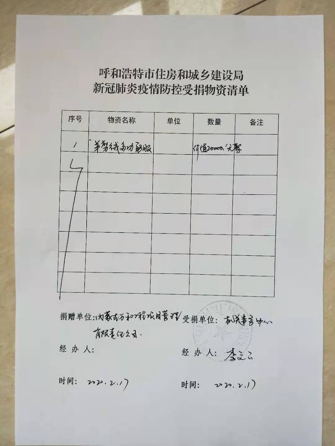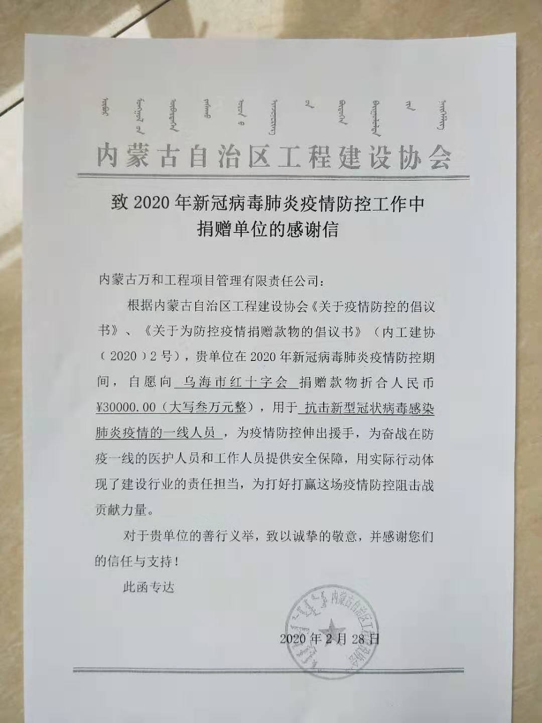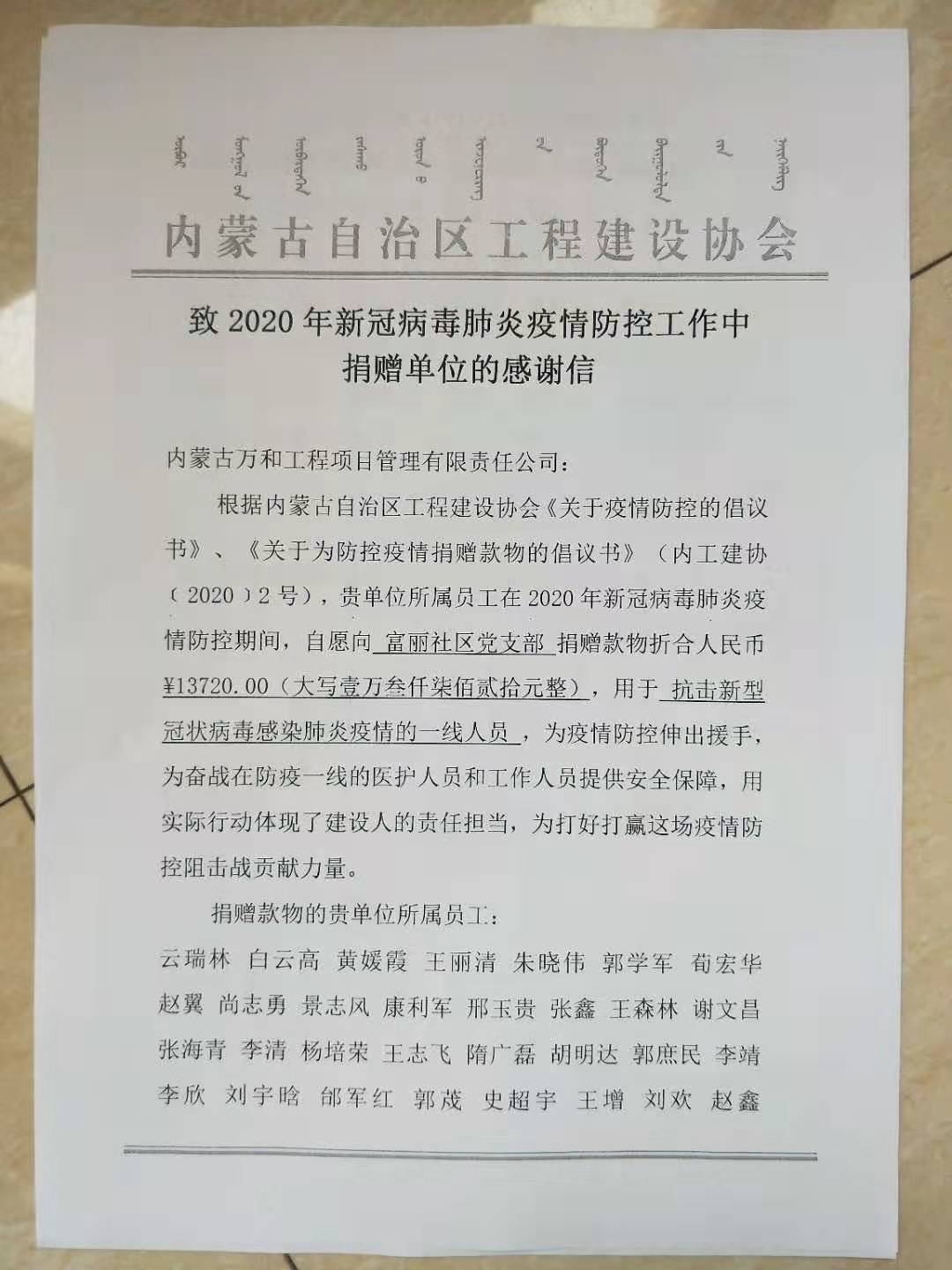 根據(jù)內(nèi)蒙古自治區(qū)工程建設(shè)協(xié)會《關(guān)于疫情防控的倡議書》、《關(guān)于為防控疫情捐贈物款的倡議書》,貴單位所屬員工在2020年新冠病毒肺炎疫情防控期間,自愿向富麗社區(qū)黨支部捐贈款物折合人民幣13720(壹萬叁仟柒佰元整)