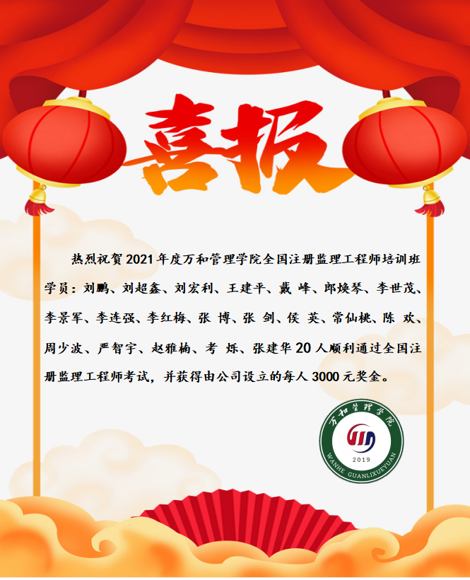 2021年注冊(cè)監(jiān)理工程師考試于近日公布成績(jī),內(nèi)蒙古萬和工程項(xiàng)目管理有限責(zé)任公司再創(chuàng)佳績(jī),共有20人通過考試,成功獲取全國(guó)注冊(cè)監(jiān)理工程師執(zhí)業(yè)資格。